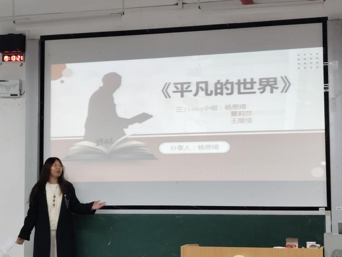 来自两个班级的七位小组代表依次登台,结合自身阅读体验,分享了触动心灵的书籍与感悟,分享内容涵盖广泛,展现出校园阅读的多元生态。杨思琦以《平凡的世界》为引,讲述了书中孙少平在困境中坚守理想的坚韧精神;杨燕妮分享了《我的阿勒泰》,她以充满唯美诗意的ppt讲解了书中所展现的女性温情以及人与自然共生的关系。其他同学分享了《围城》《边城》《嫌疑人x的献身》《我与地坛》等。此外,四班的同学还带来了《红楼梦之刘姥姥进大观园》的剧本表演,演绎了刘姥姥与贾家之间发生的啼笑皆非的故事。