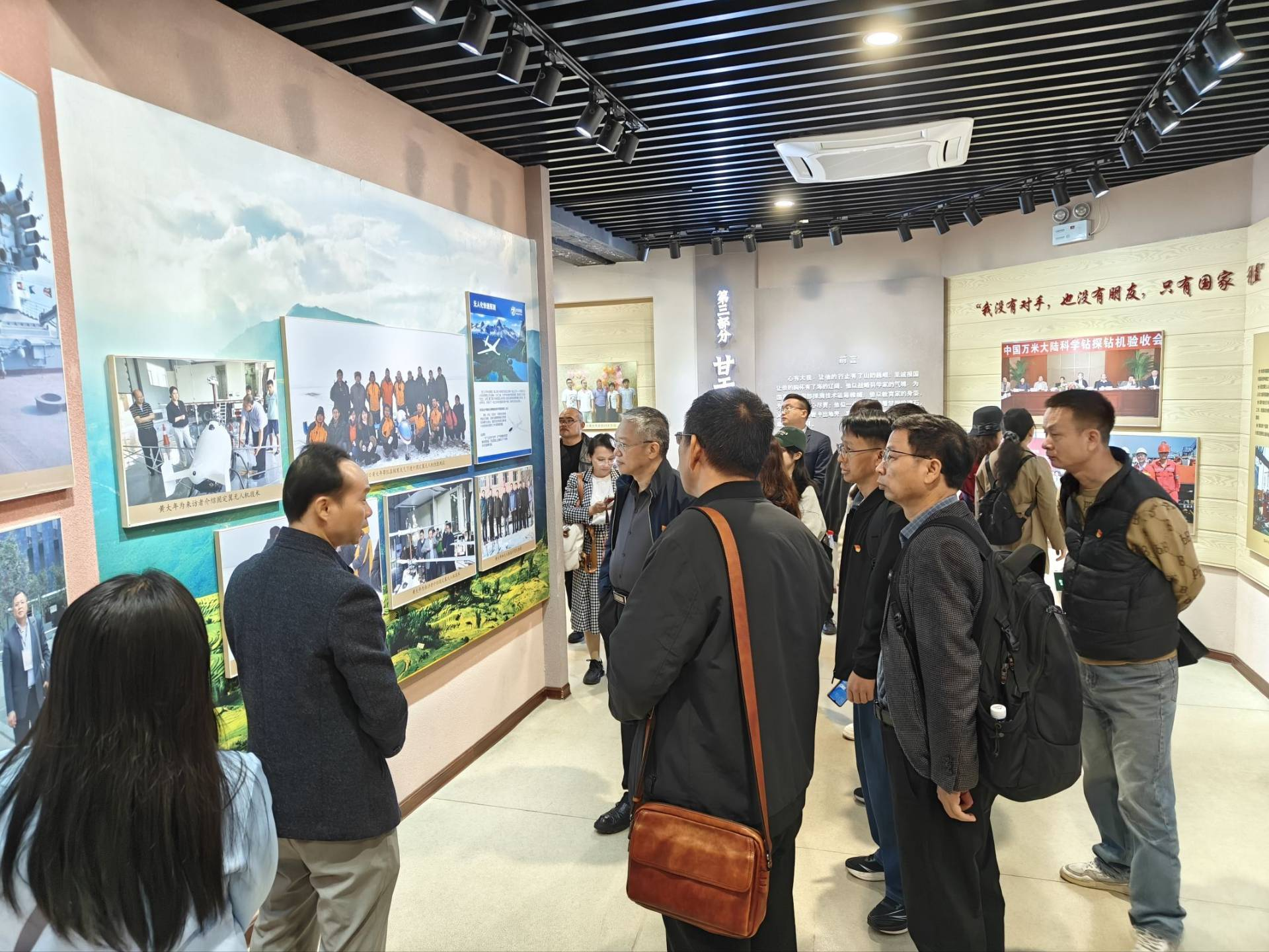 全体参加活动的人员到达黄大年的高中母校贵港市第八高级中学后,首先学习了2017年习近平对黄大年同志先进事迹作出的重要指示,然后怀着崇敬的心情走进黄大年纪念馆。