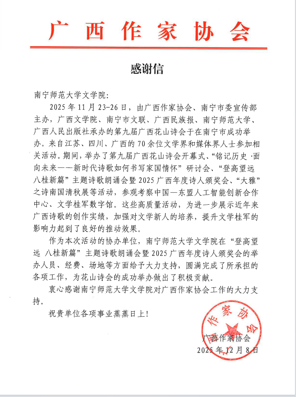 在"登高望远 八桂新篇"主题诗歌朗诵会暨2025广西年度诗人颁奖会的举办人员、经费、场地等方面给予大力支持,圆满完成了所承担的各项工作,为花山诗会的成功举办做出了积极贡献。