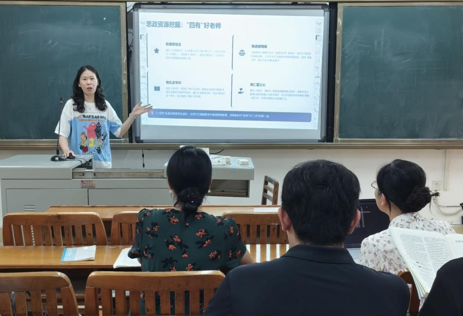 围绕“四有”好老师标准融入课堂教学,黄铮老师提出,课程内容应深入挖掘教育家精神内涵,如:以于漪老师“一辈子做教师,一辈子学做教师”的执着坚守为示范,在文本教学中传递“心有大我、至诚报国、仁爱之心、启智润心”的师者品格。教研室教师也纷纷发表看法,大家一致认为:课程教学需通过文本细读、情感共鸣等方式,引导师范生在潜移默化中坚定从教信念、涵养高尚师德。