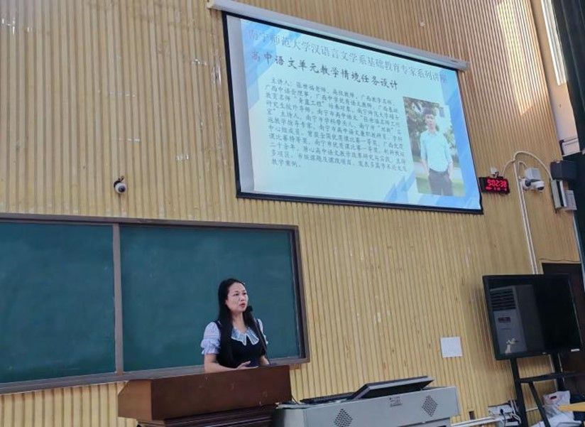 邀请了广西教学名师、广西中学优秀语文教师张世福,为师范生带来题为《高中语文单元教学情境任务设计》的专题讲座,对师范生教师技能比赛进行实战指导。讲座由跳蛋视频
