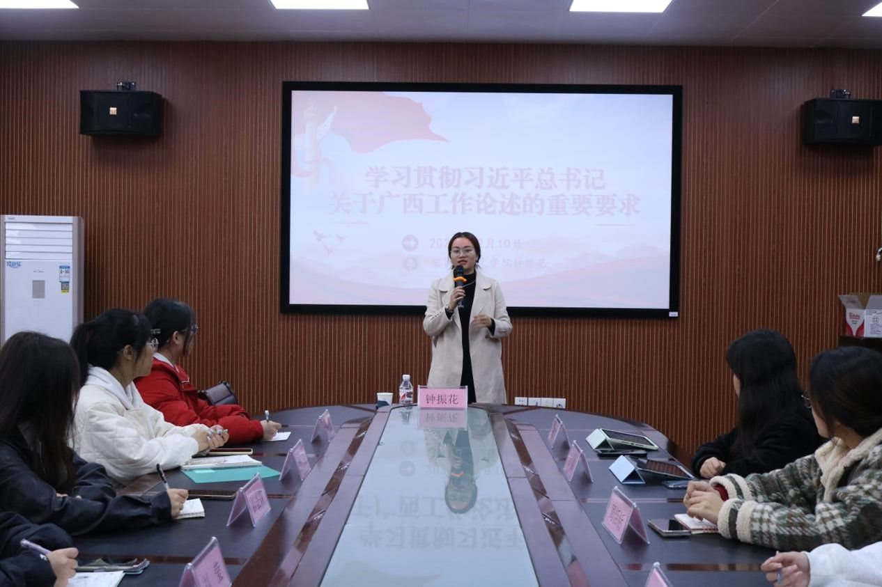 会上,钟老师向同学们阐述了习近平总书记关于广西工作论述的重要要求的丰富内涵和实践路径。并结合广西近几年发展状况,以发展特色农产品为例,指出扎实推进共同富裕、持续推进新时代兴边富民行动于广西的重要性。此外,她还鼓励同学们要加强理论学习,坚持以习近平新时代中国特色社会主义思想为指引,时刻关注广西发展动态,以实际行动践行社会责任。与会同学认真聆听并记录要点,积极与钟老师交流感想。