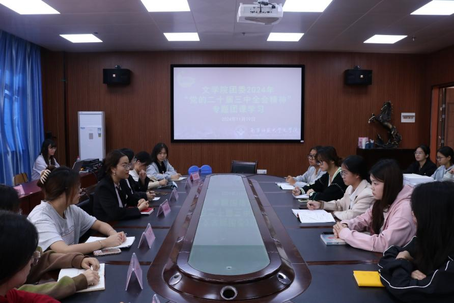 于11月19日上午在理科综合楼404会议室举行“学习党的二十届三中全会精神”专题团课。本团课由团委书记钟振花主持,团委学生会常委团及各部门负责人参加。