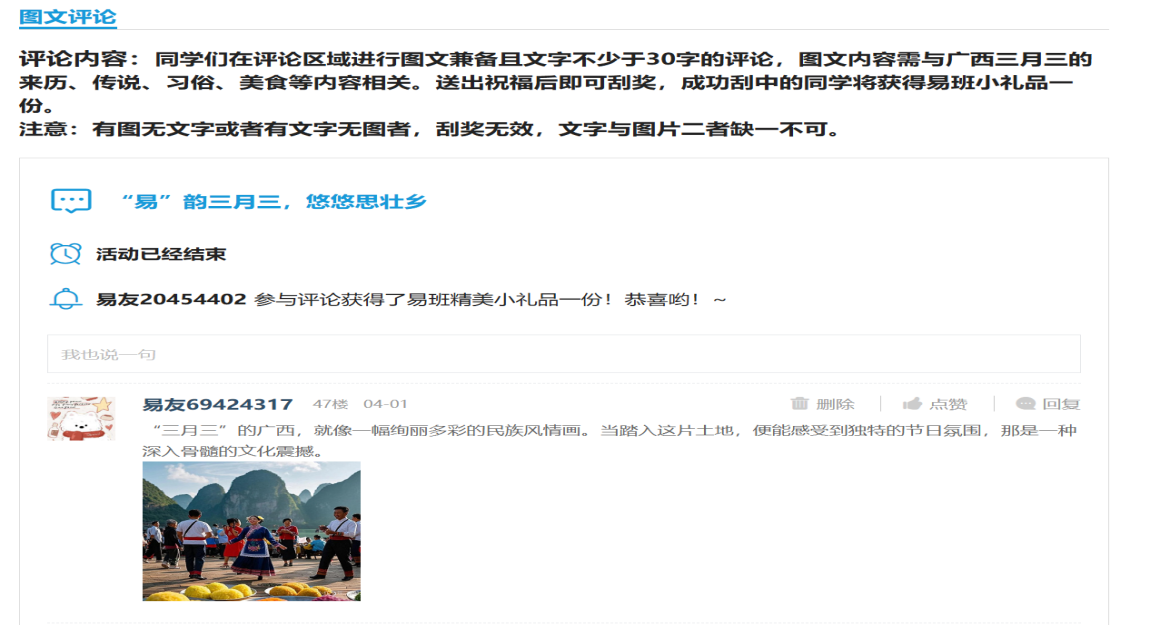 本次活动内容包含“绵绵八桂情,结梦三月三”易班优课答题和“‘易’韵三月三,悠悠思壮乡”评论抽奖活动。在易班优课答题环节,同学们积极参与,通过线上答题的方式展现了他们对壮族三月三文化的了解,成绩优异者获得易班小礼品。同时,评论抽奖活动环节也反响热烈,同学们在易班APP话题区踊跃留言,分享自己对三月三的独特见解和节日体验。留言内容积极向上,不少同学还配上精美的节日照片,展现了浓厚的节日氛围。活动结束后,易班工作站从优质评论中随机抽取幸运参与者,赠送精美小礼品,进一步激发了同学们的参与热情。