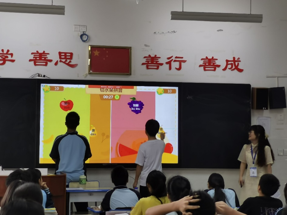 本次语文公开课是由实习生卢静执教,主题是“小人物,大情怀”。卢静以微视频创设情境,营造了浓厚的学习氛围。卢静通过设计三个学习任务,在课堂上带领学生分析人物、对比人物、读懂文章。卢静的课堂教学形式多样,比如通过切水果记拼音,连连看认识生字,小记者的互相提问等,真正让学生们成为课堂的主人,学生积极主动回答问题,踊跃举手发言,有乐趣有收获。